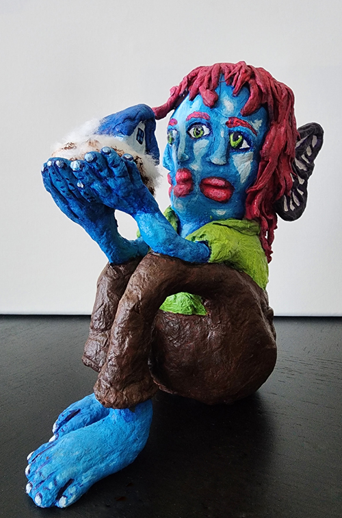 Hatching an Idea sculpture by Christy Strickler showing a seated figure holding a nest with a newly emerged home, created with spun cotton and acrylic paint