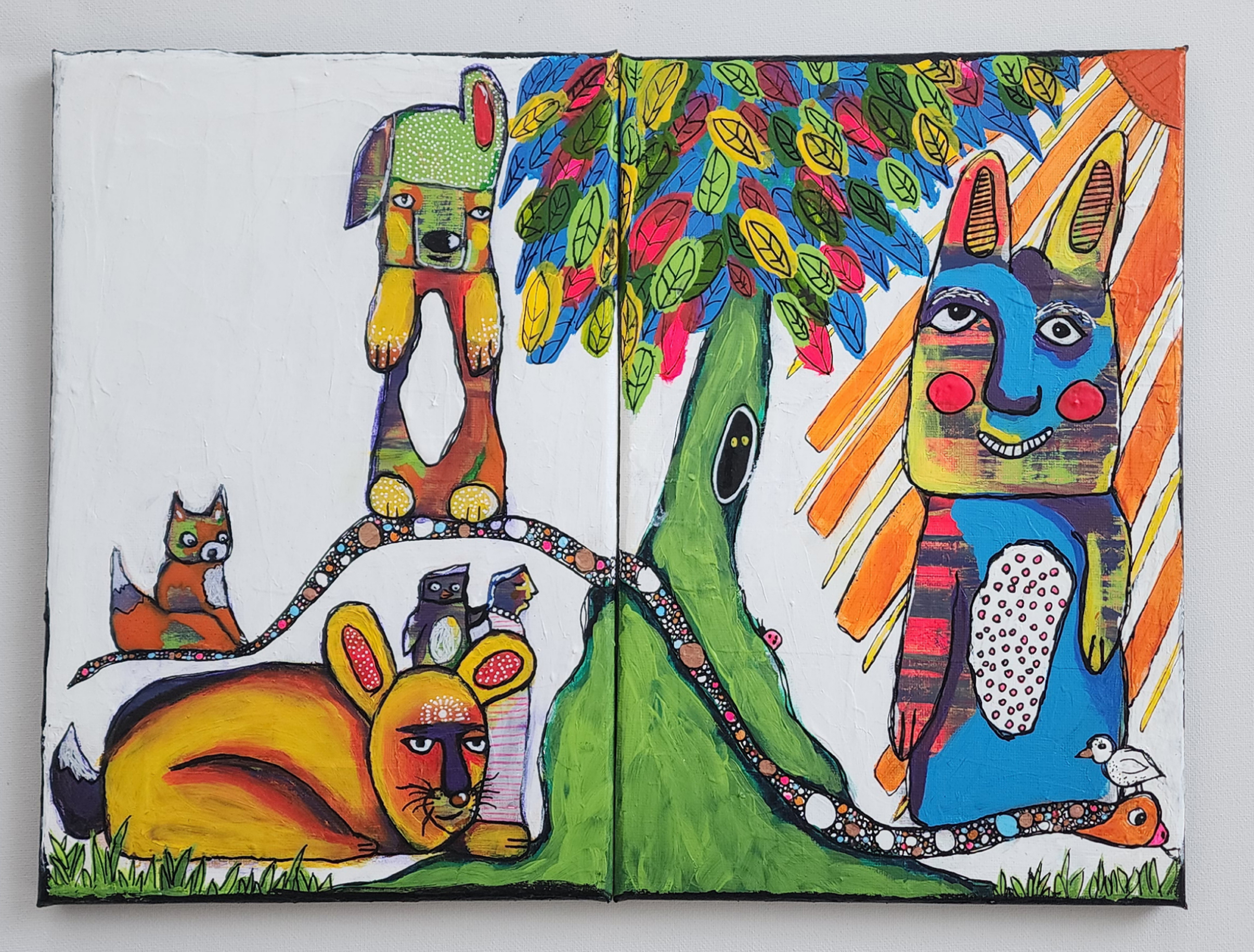 The story began on one canvas but grew to fill a second. Sometimes, when you feel a bit different from the crowd, comfort is best found in the company of your pets or  your own weird creatures. In this piece, a tired woman rests under a tree of her thoughts. Her fears are hidden inside the tree trunk. A menagerie of creatures surrounds her and the tree.  A penguin gently pats her on the back while a mouse rabbit creature snuggles in closely. A kindly snake crawls around her thoughts carrying with it a depressed dog, a weird bunny, and an anxious overthinking fox.  An idea in the form of a small bird rides upon the snake’s head. The sun shines brightly on the whole scene, representing hope and happiness.